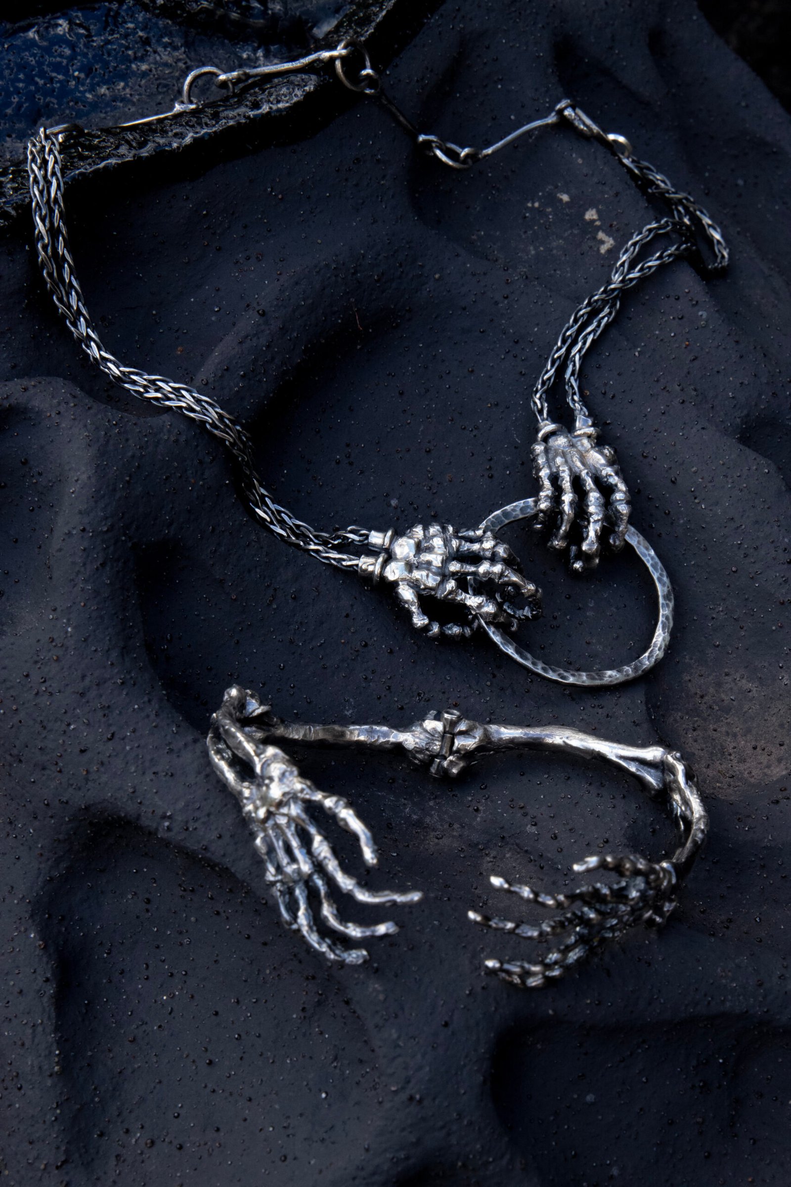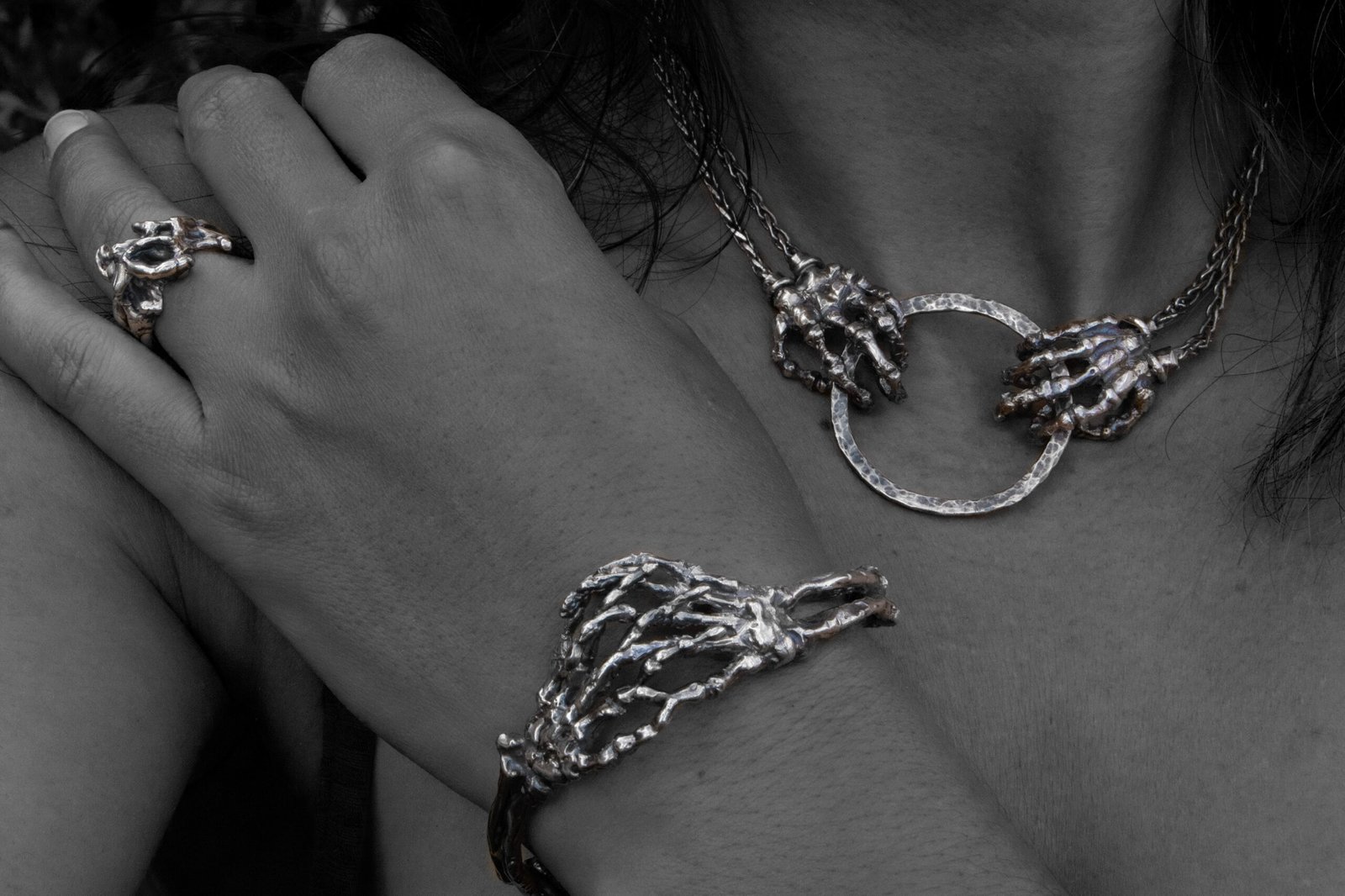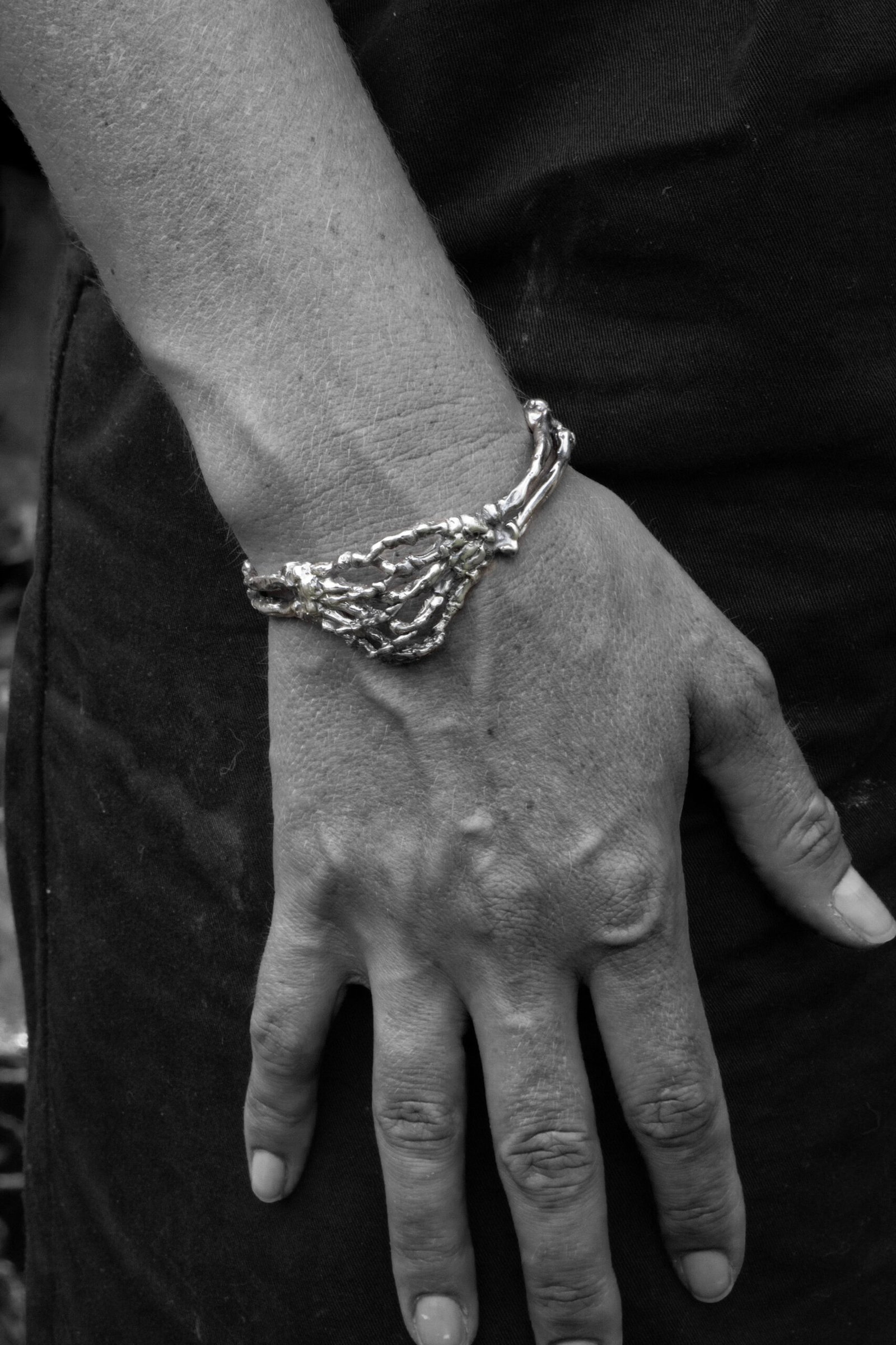 Crafted in sterling silver and finished with an oxidised patina, this sculptural cuff features mirrored ulna, radius, and skeletal hand forms joined by a concealed hinge. The hands meet in an intimate clasp, securing the piece around the wrist. Polished highlights accentuate the anatomical detail, creating a striking contrast between shadow and shine.