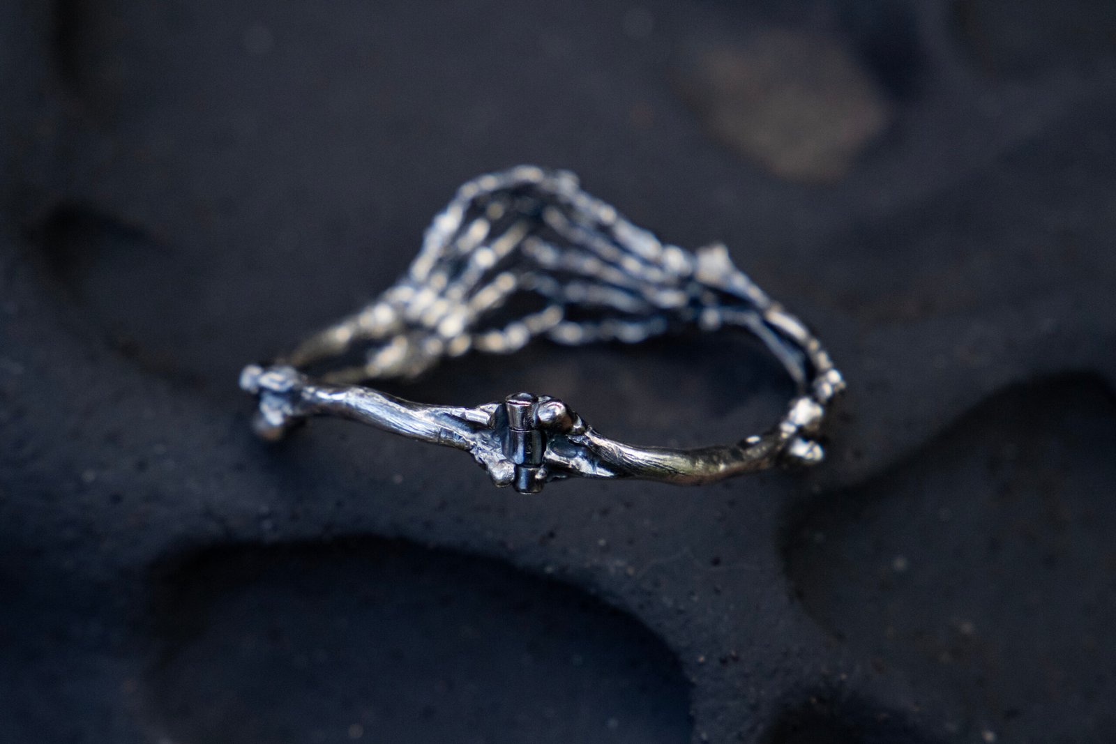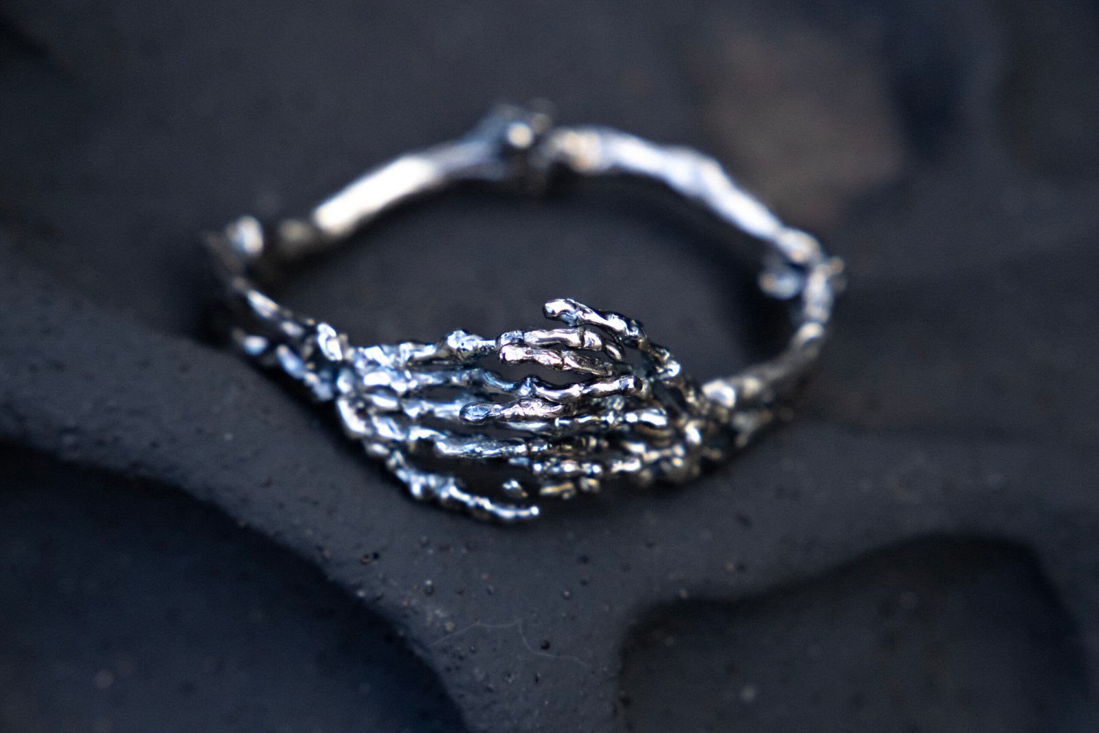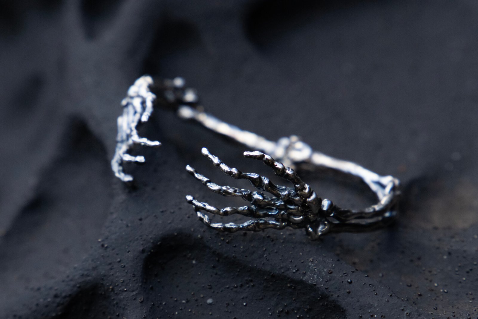 Crafted in sterling silver and finished with an oxidised patina, this sculptural cuff features mirrored ulna, radius, and skeletal hand forms joined by a concealed hinge. The hands meet in an intimate clasp, securing the piece around the wrist. Polished highlights accentuate the anatomical detail, creating a striking contrast between shadow and shine.